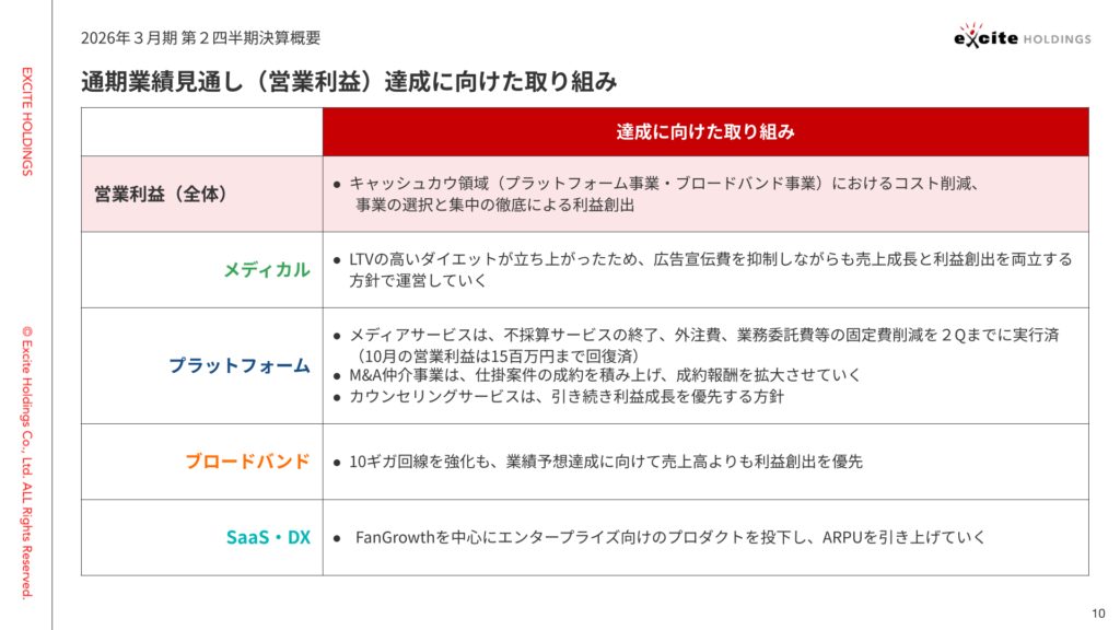 キャッシュカウ領域のプラットフォーム事業においては、メディアサービスで、不採算サービスの終了や、外注費、業務委託費などの固定費削減を2Qまでに実行いたしました。 また、M&A仲介事業では、仕掛案件の成約を着実に積み上げ、成約報酬を拡大させていく方針です。カウンセリングとブロードバンドにつきましては、引き続き売上高成長よりも利益成長を優先してまいります。