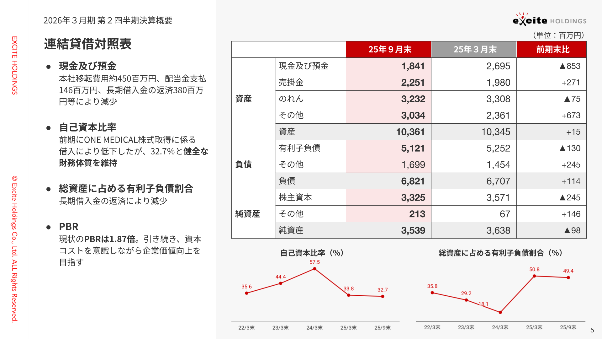 自己資本比率の推移につきましては、前期に実施したONE MEDICAL社の株式取得に伴う借り入れの影響によるもので、引き続き健全な財務体質を維持しています。