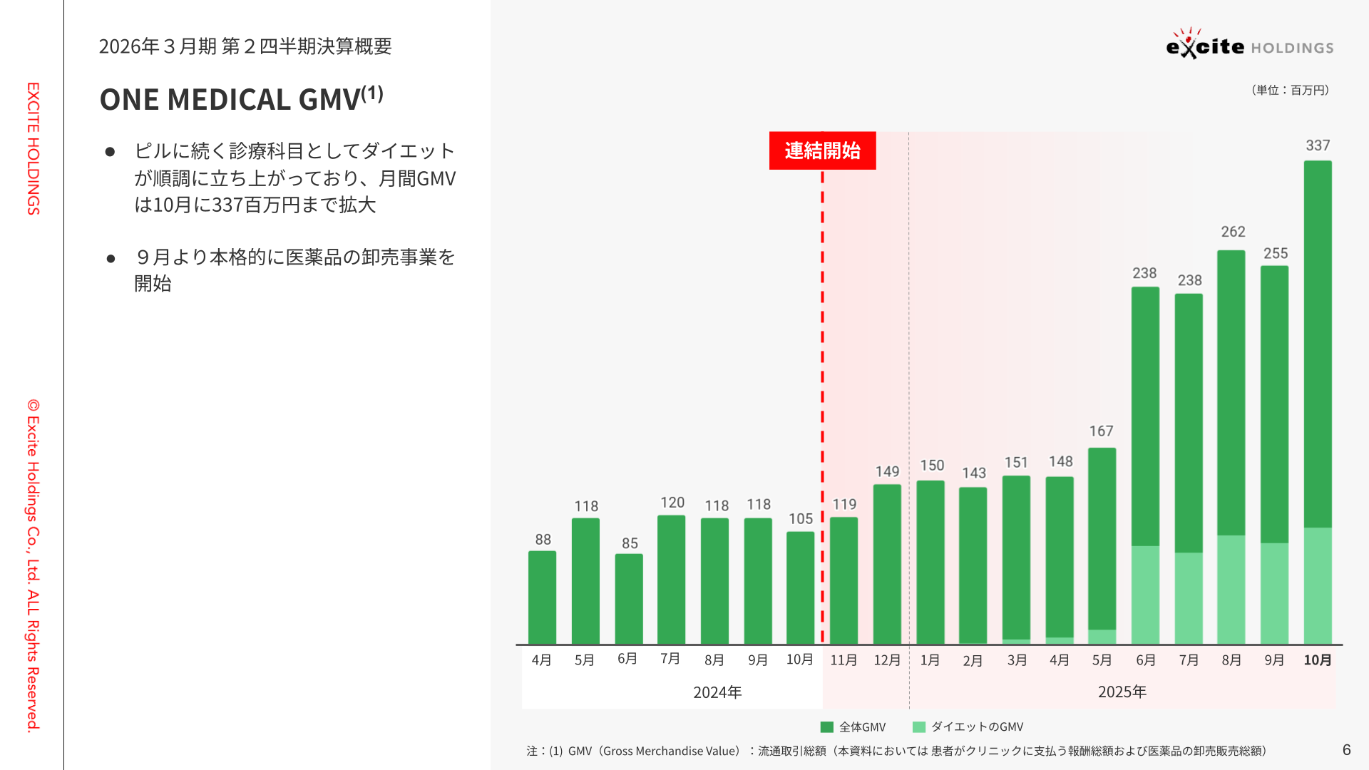 ご覧の通りGMVは引き続き順調に拡大しており、月間GMVは10月には3億3,700万円に達しました。こちらはピルに続く新しい診療科目として、ダイエットが順調に立ち上がっており、LTVの高い顧客基盤が着実に積み上がっています。