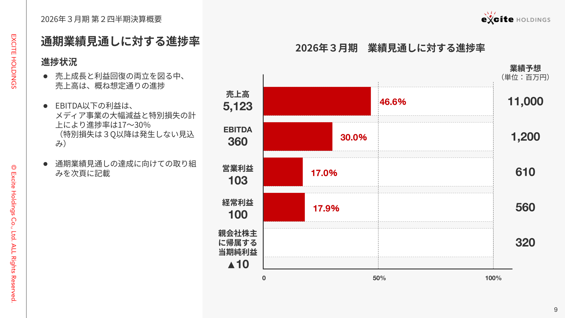 通期業績見通しに対する進捗率です。売上成長と利益回復の両立を図る中、売上高は進捗率46.6%と、概ね想定通り推移しています。EBITDA以下の営業利益に関しましては、メディア事業の大幅減益と1Qの特別損失により進捗率17〜30%となっていますが、先程のご説明通り特別損失は折り込み済みのもので今後発生しない見込みです。