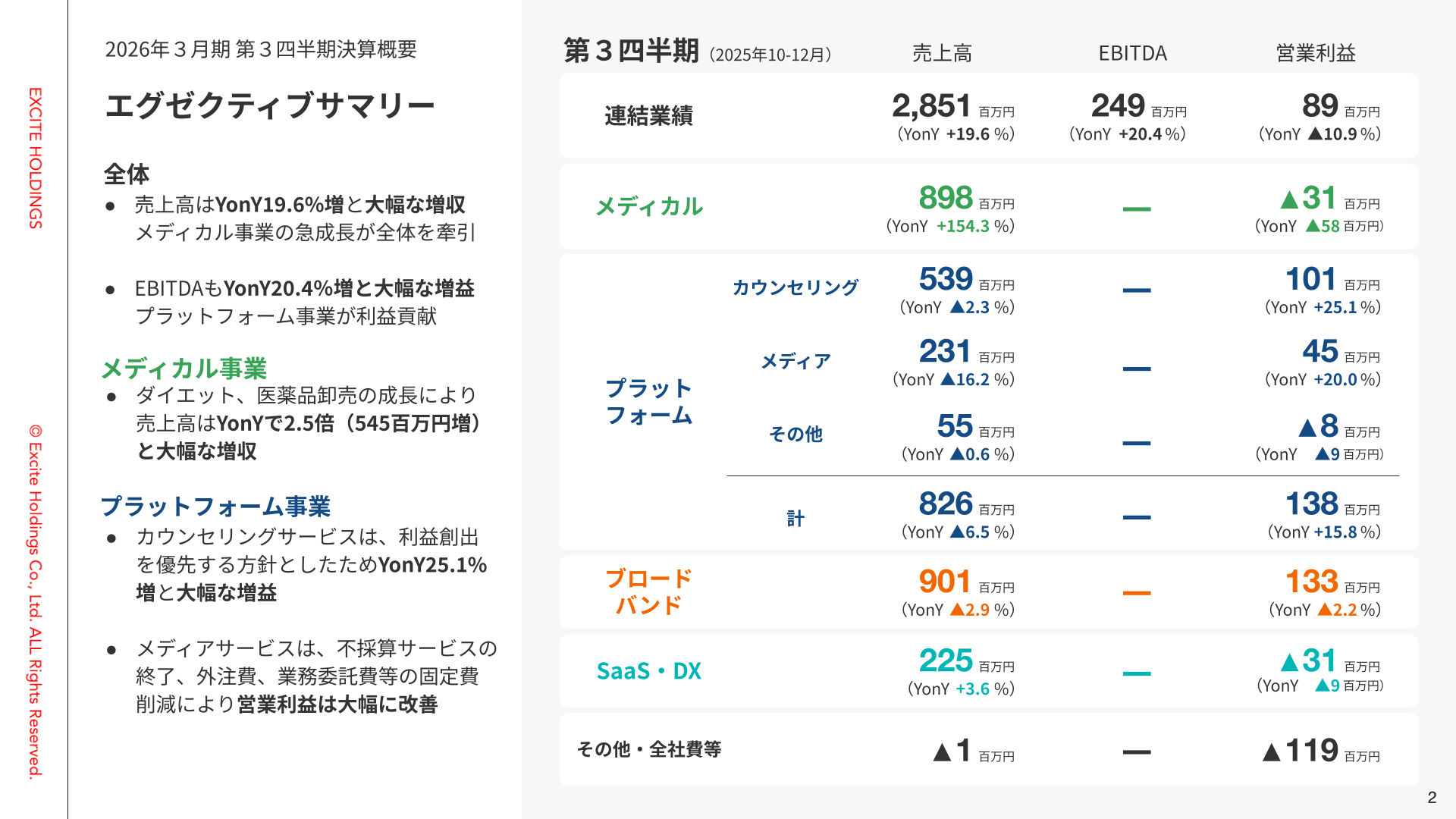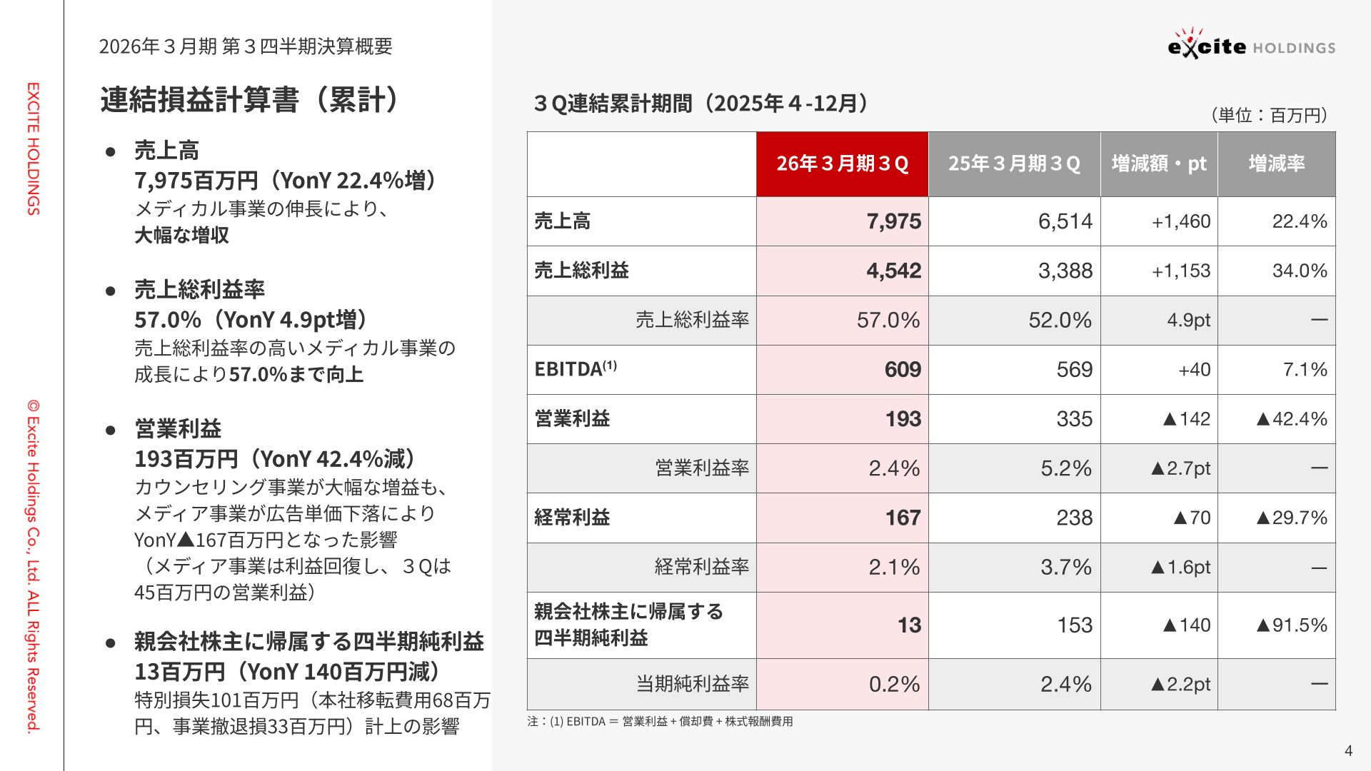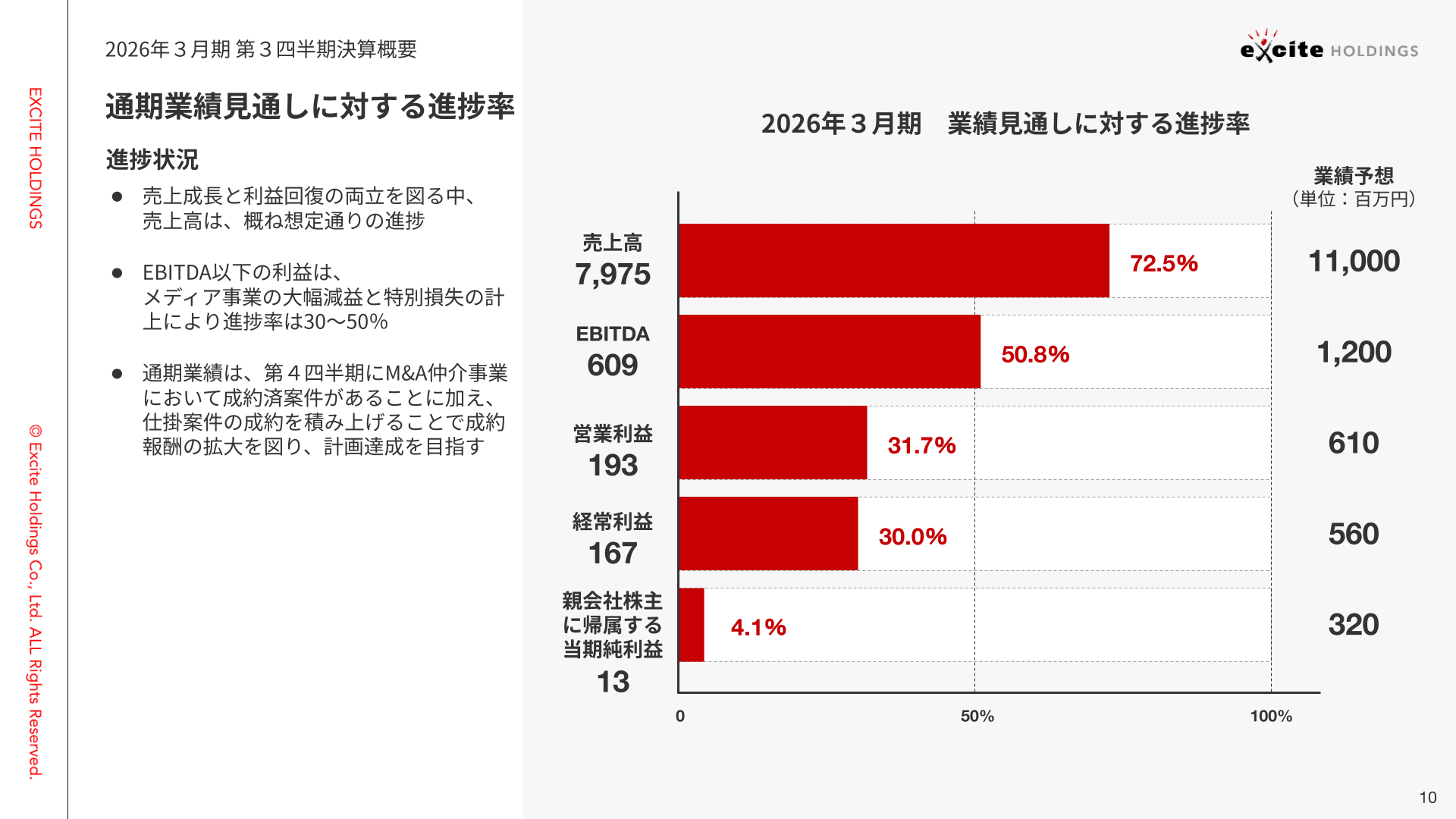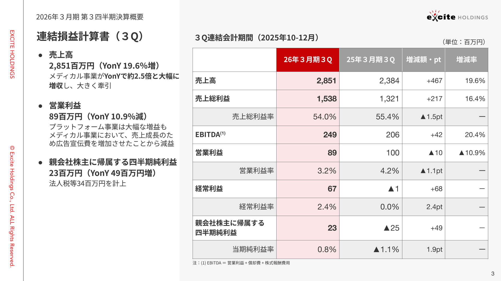 ただいまより、エキサイトホールディングス株式会社 2026年3月期第3四半期の決算についてご説明いたします。