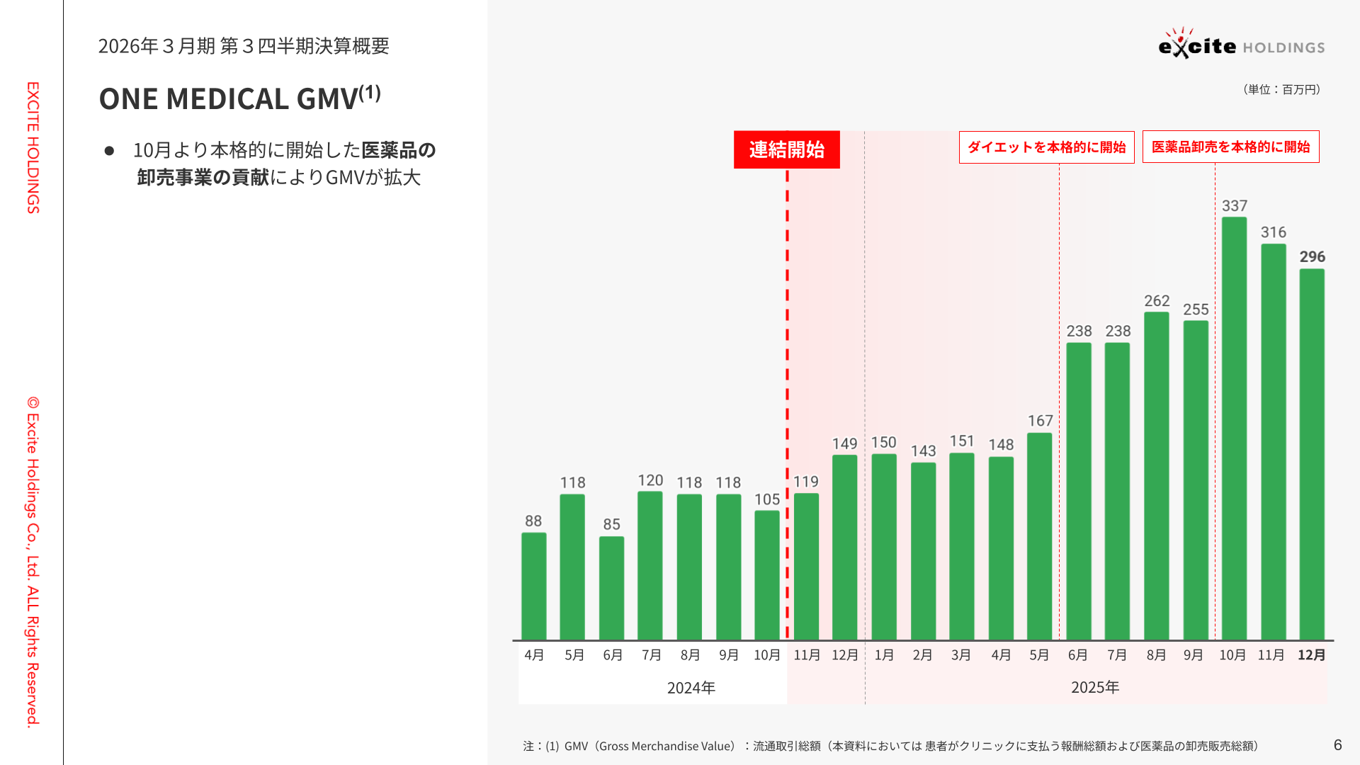 ONE MEDICALの月間GMVは、医薬品卸売事業の拡大により10月に3億3,700万円に達し、以降も高い水準で推移