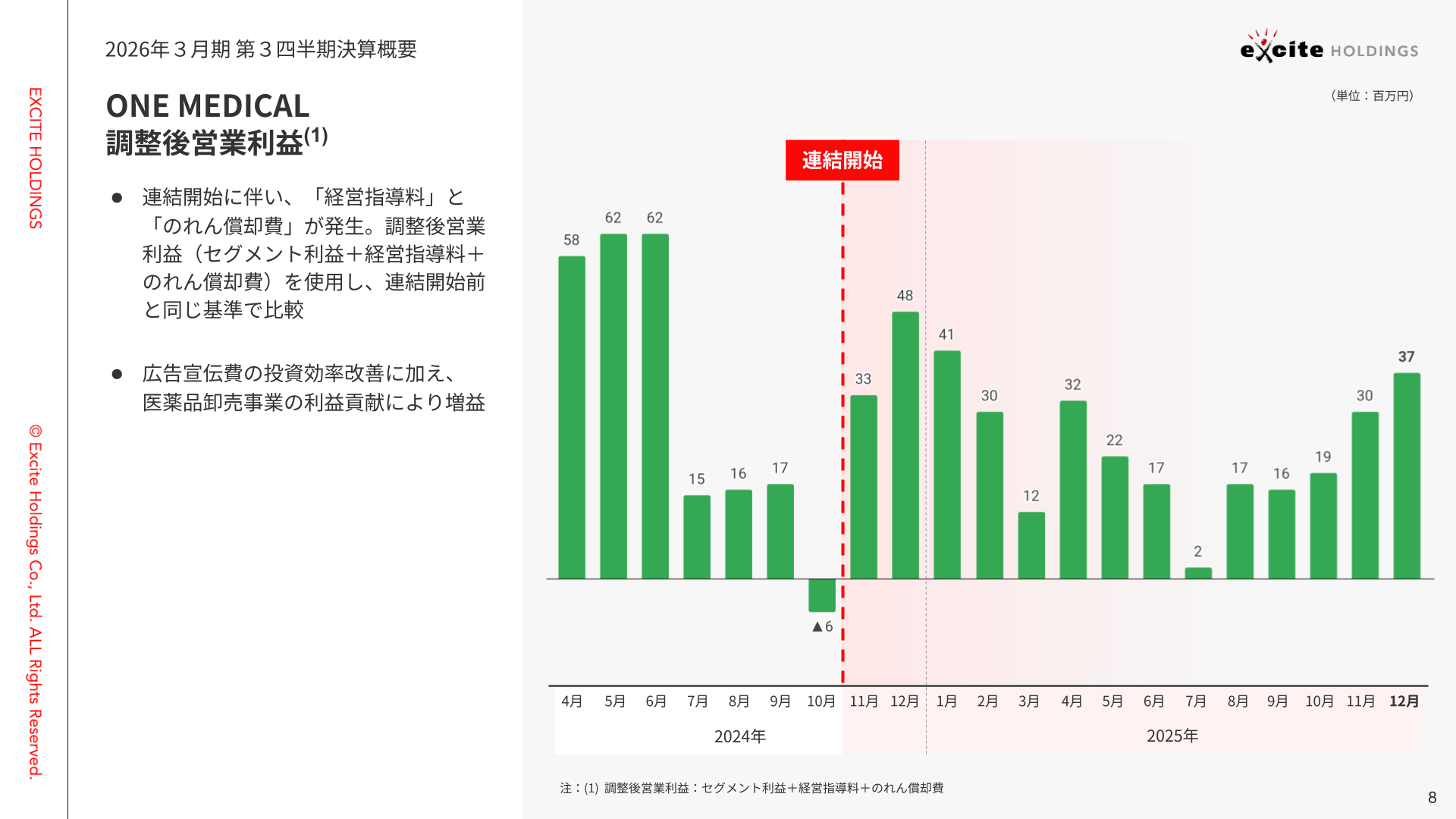 ONE MEDICALの調整後営業利益は、広告宣伝費の投資効率改善と医薬品卸売事業の利益貢献によって増益