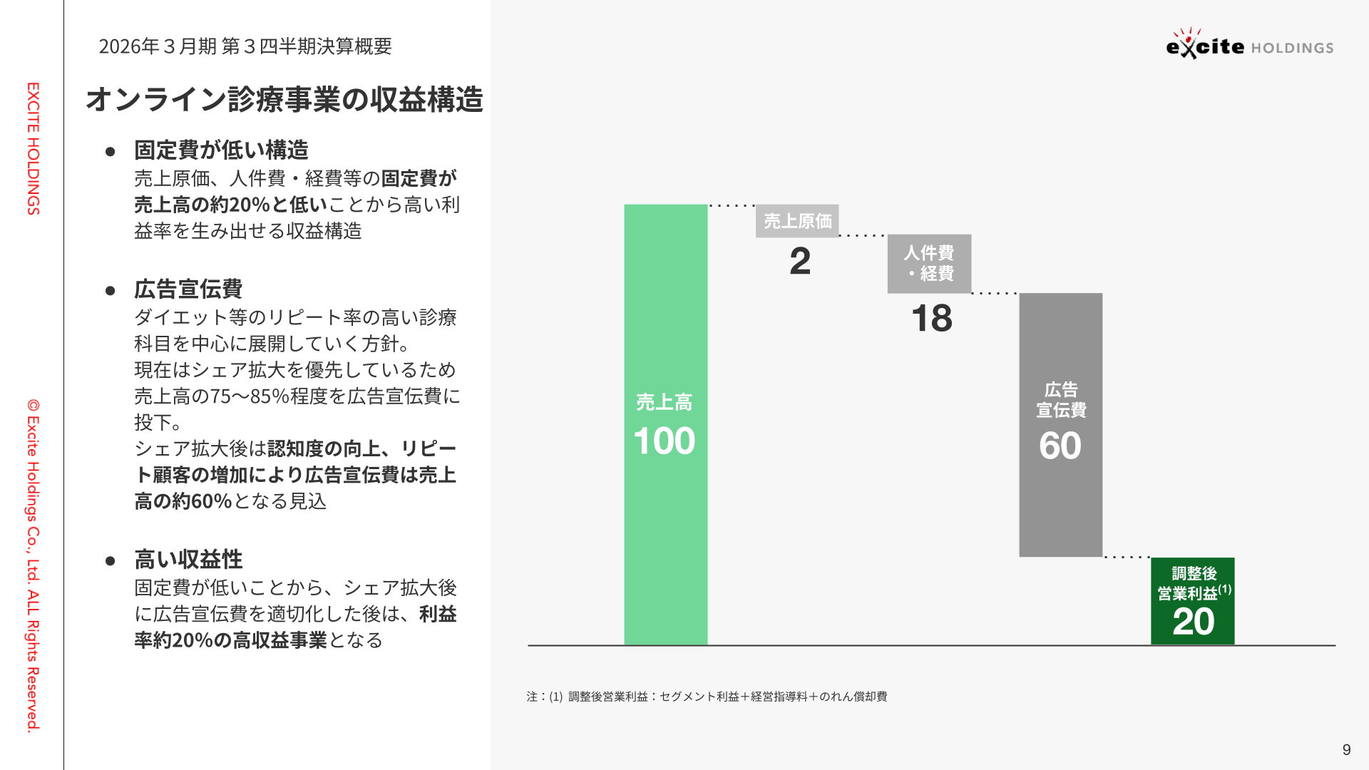 一定のシェアを獲得した後は、認知度の向上やリピート顧客の増加により、広告宣伝費率は段階的に低下し、売上高比でおおむね60%程度が適正水準になると考えております。また、売上が拡大しても人件費やシステム費などの固定費は急激には増えないため、売上の増加分がそのまま利益に結びつきやすい事業構造となっております。このような構造を背景に、広告宣伝費を適切化した後は、将来的に営業利益率20%程度を目指せる高い収益性の事業になると見ております。
