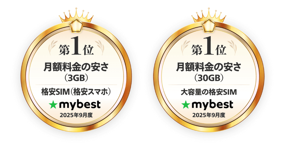 - 光回線とのセット割(家族まるごとセット割)で更に安く※ マイベスト月間アワード – 格安SIM(格安スマホ)月額料金の安さ(3GB)2025年9月度※ マイベスト月間アワード – 大容量の格安SIM 月額料金の安さ(30GB)2025年9月度
