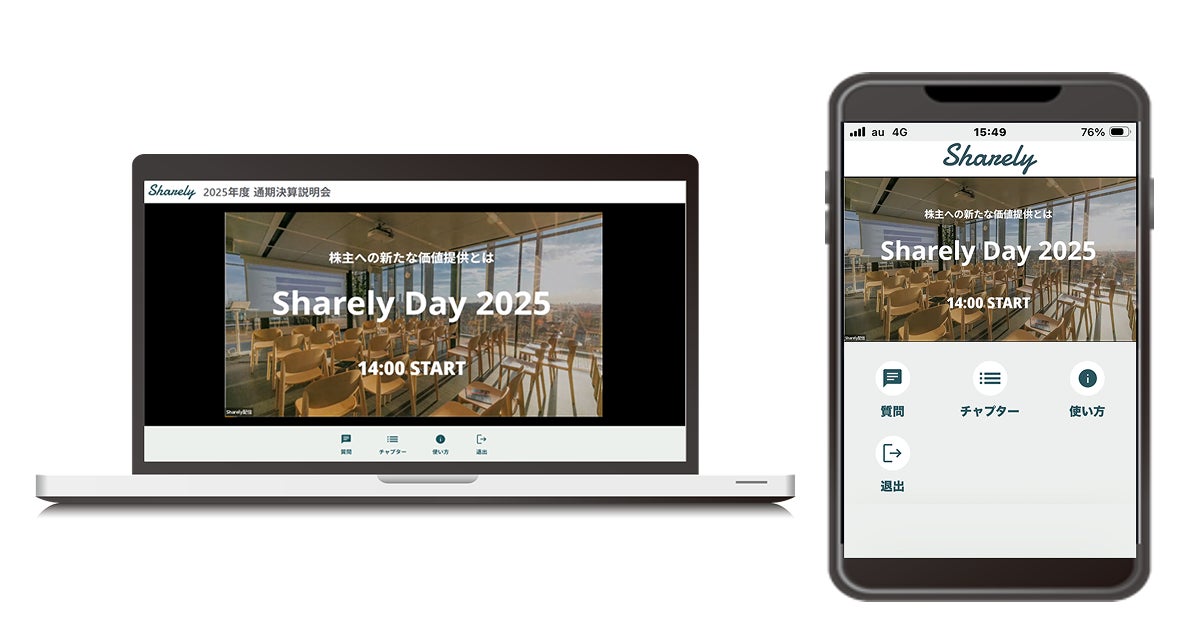 上質な設備とプロユースの機材を揃えたハイスペックなスタジオ「PLAY STUDIO」と、直感的に使える「Sharely IR」のUI/UXを組み合わせることで、より多くの企業が決算説明会をオンライン開催やオンデマンド配信で効率的に実施できる環境を実現します。今後もSharelyでは、決算説明会のデジタル化をサポートすることで、決算説明会への参加をより身近なものに変え、投資家との接点強化に貢献していきます。